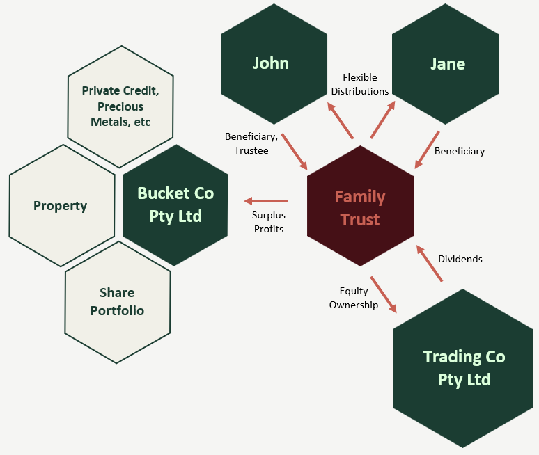 The diagram shows one example of how this can work. In this scenario, the trading company runs the business, with ownership held through a discretionary family trust. Profits can be distributed to individuals where appropriate, or streamed into a separate bucket company, where excess profits can be retained and invested into assets like property, shares, private credit or other investments – well away from the operating risk of the firm.